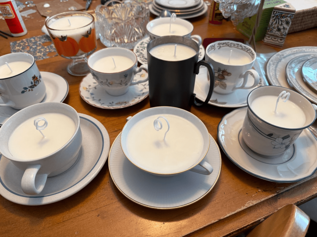 My second new craft, tea cup candles, sold really well.  All the tea cups I used for these candles are thrifted, and I love how eclectic the mix of styles is.  I used soy wax for easy cleanup, and because it burns with less smoke.  My favorite personal touch: curling the wicks to look like little puffs of steam rising from a hot tea cup.