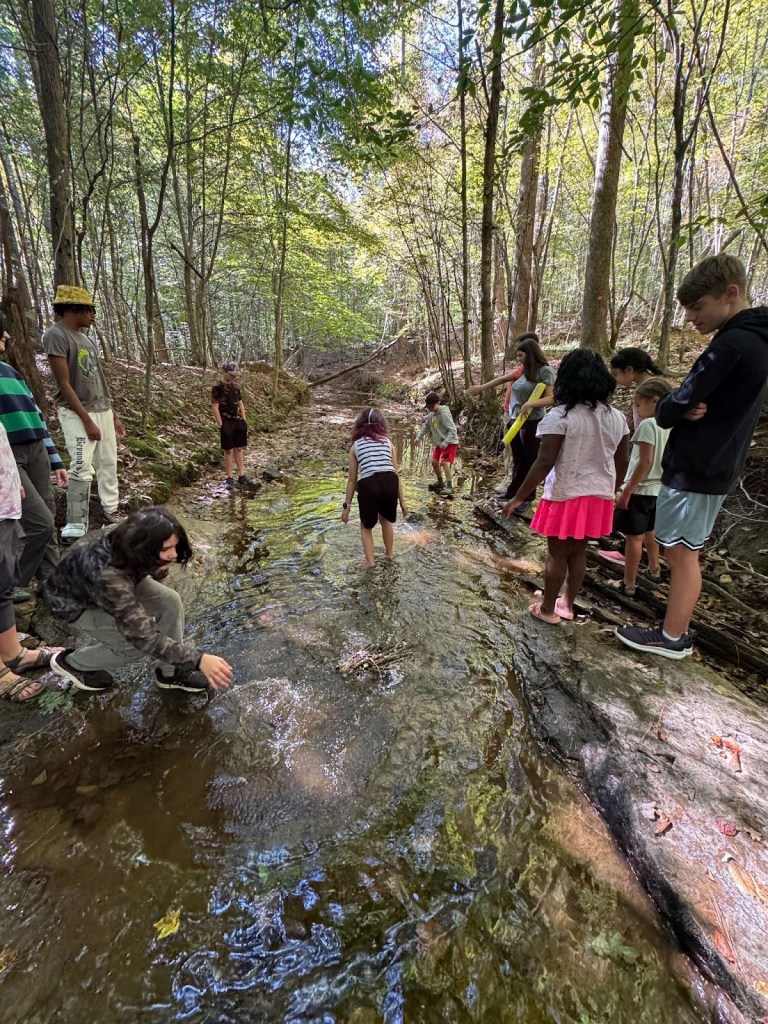 In the morning, we’ll typically take a longer hike to a creek where we’ll have lunch and do some creek exploration. Most of the time, the campers want to try and find crawfish and frogs in the creeks, and some of them make little boats out of leaves and sticks.