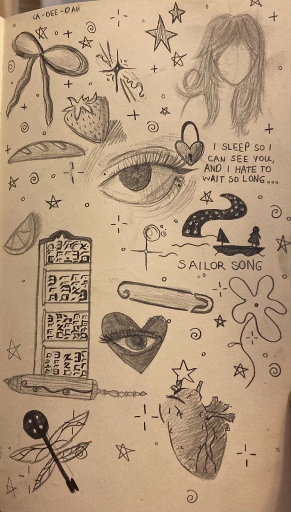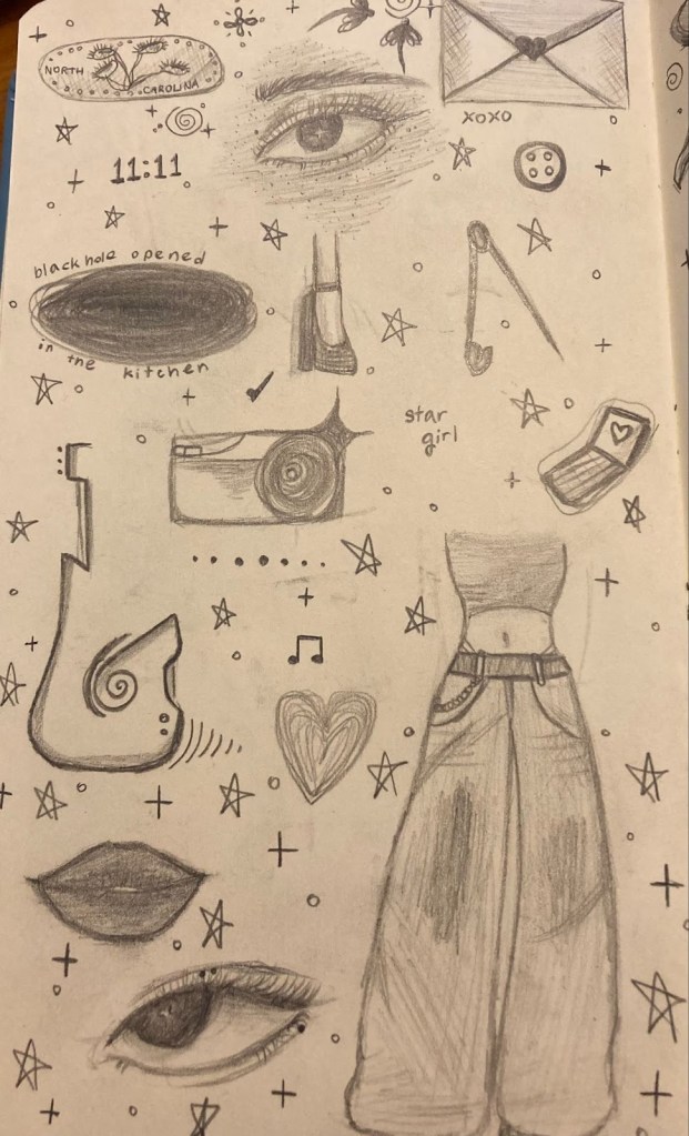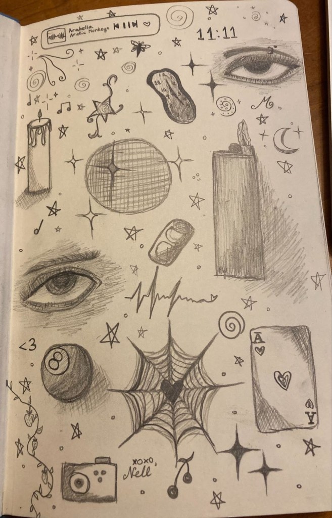 I really like putting on music and just sketching whatever comes to mind. TV Girl, The Smiths, Arctic Monkeys, and Phoebe Bridgers are my current favorite musical artists, especially for drawing. I’ve found that I love drawing eyes and musical motifs, like guitars. So far I’ve been working with different graphite pencils, but I’m planning to experiment with color the next time I sit down to sketch.